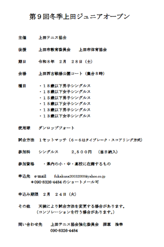 第9回冬季上田ジュニアオープン大会要項